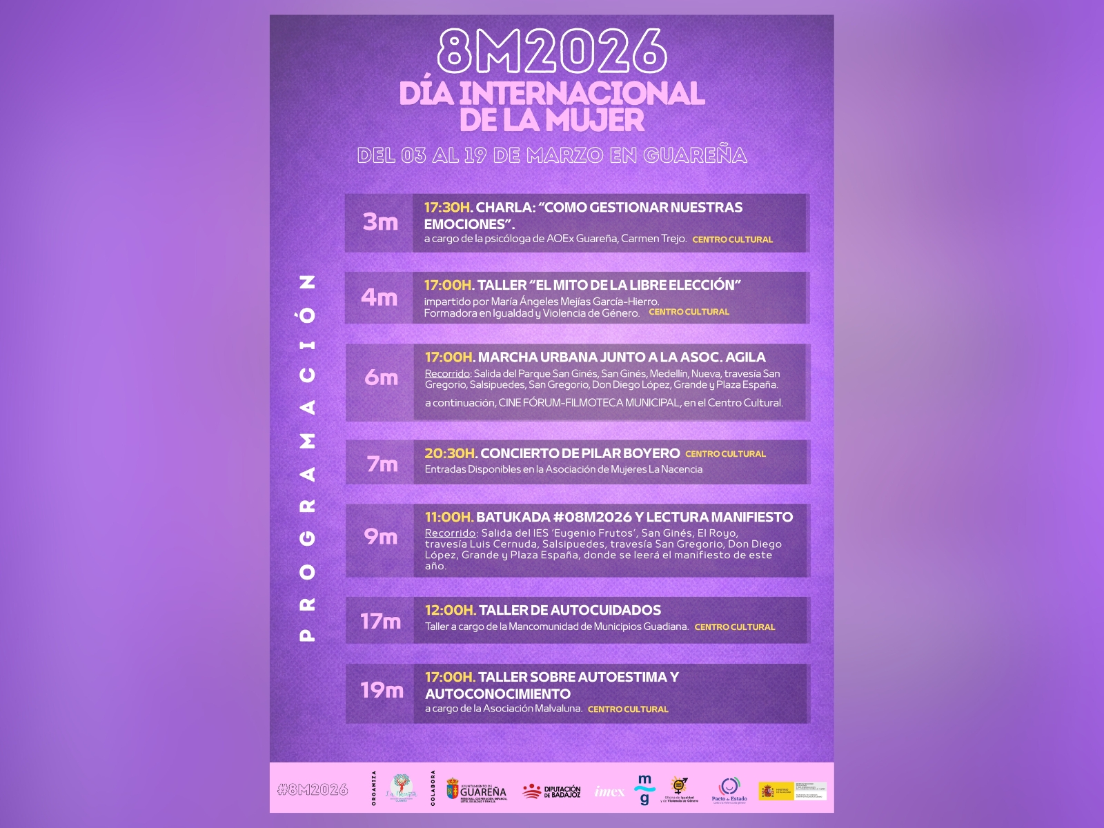 La Asociación Cultural de Mujeres La Nacencia, en colaboración con el área de Igualdad del Ayuntamiento de Guareña y en colaboración con otras asociaciones y entidades, acaban de dar a conocer la programación de actividades con motivo del 8M de este año, el Día Internacional de la Mujer.